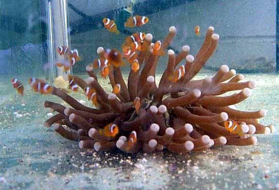27-day old Amphiprion percula, the true clown anemonefish with anemone coral.
